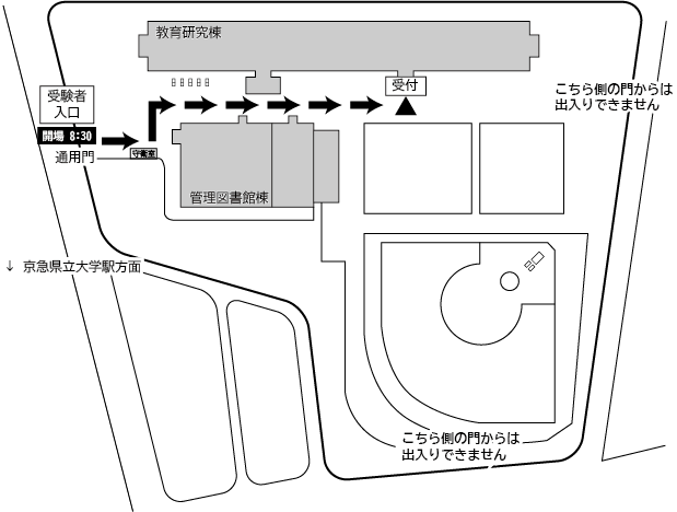 受験者を送迎する自家用車等が大学周辺の道路に駐停車することにより、周辺住民の多大な迷惑となりますので、自家用車等による受験者の送迎はお控えください。