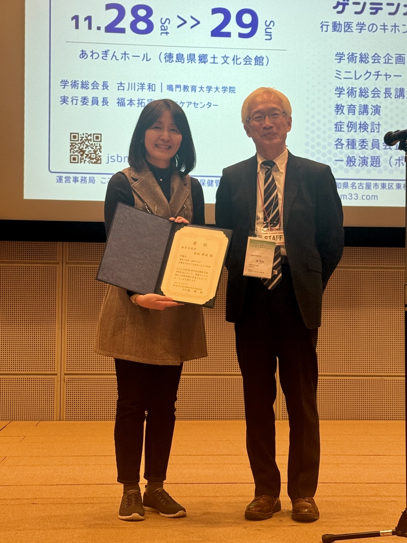 贈呈式で大会長の堤明純先生(北里大学)から賞状を授与