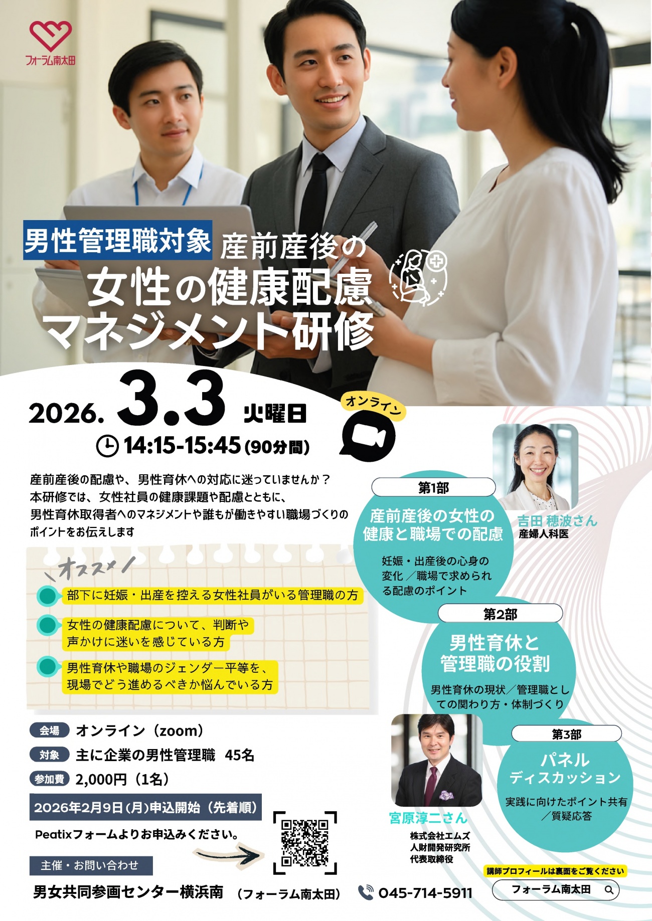 多様な働き方が進む中で、産前産後の健康配慮と育休をめぐるマネジメントは、個別配慮にとどまらず、人材定着・職場の心理的安全性・組織の持続可能性に直結する重要なテーマです。ぜひご参加ください。