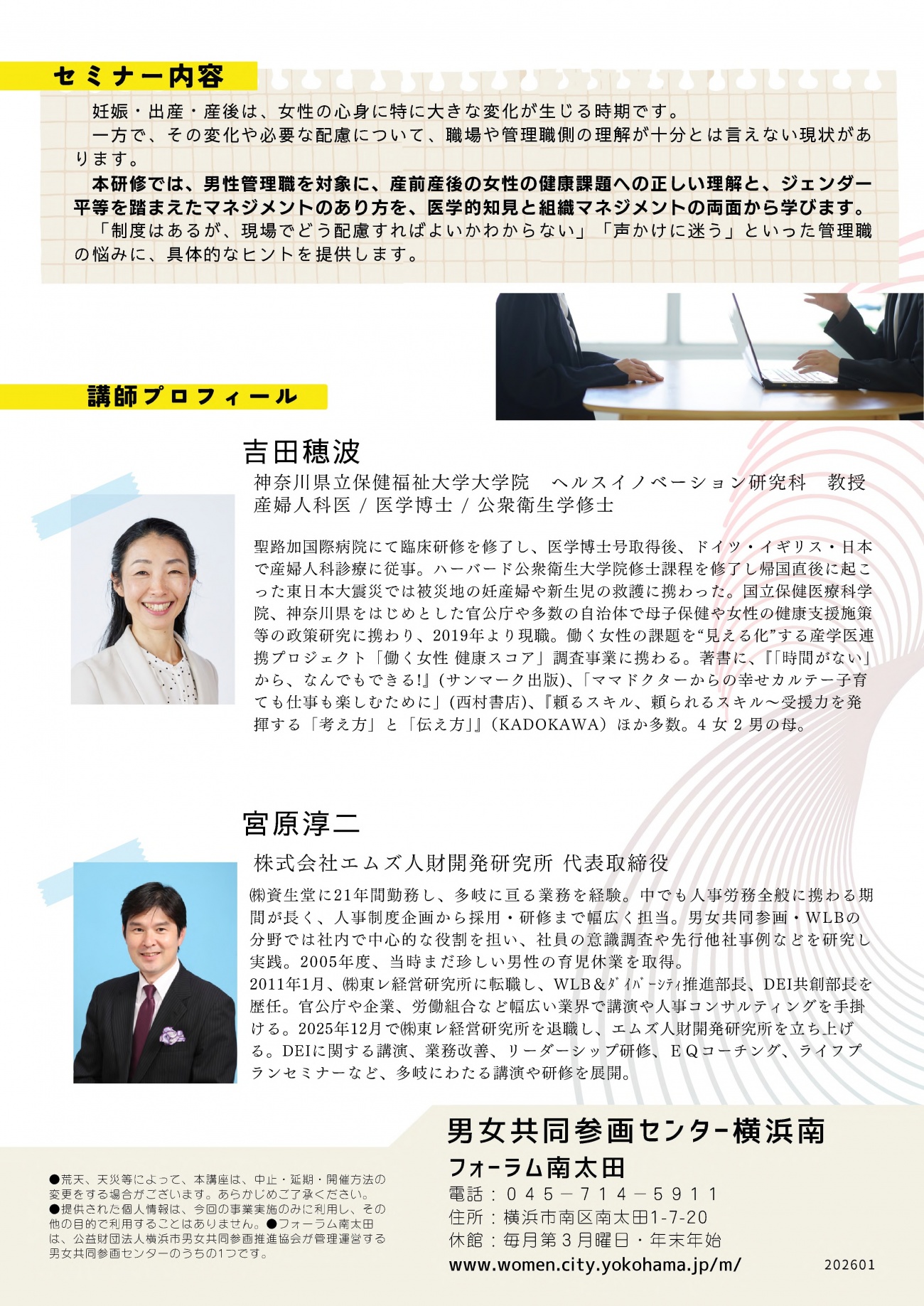 戻るオンライン研修:2026年3月3日(火)、男女共同参画センター横浜南(フォーラム南太田)主催 男性管理職対象|産前産後の女性の健康配慮マネジメント研修(医学×現場マネジメント)にて吉田教授がオンライン講師を務めます!