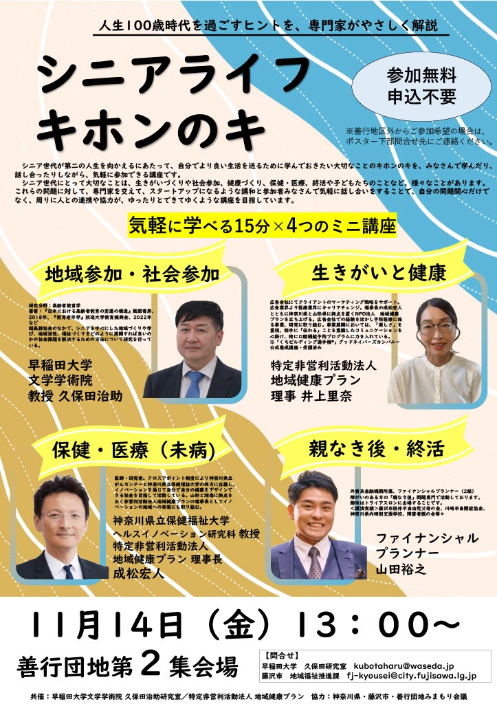 11月14日(金)開催の「シニアライフ キホンのキ」に本学発ベンチャー「特定非営利活動法人地域健康プラン」の理事であり、兼本学教員の成松教授が登壇します。 ぜひこの機会にご参加ください。